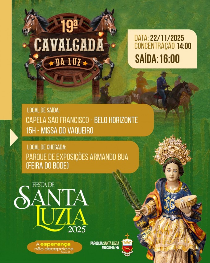 “Meus irmãos e minhas irmãs, é com grande alegria que convido todos vocês para a nossa querida Cavalgada da Luz, um momento de fé, tradição e comunhão que integra a linda festa de Santa Luzia. Que possamos, juntos, percorrer esse caminho iluminado, levando nossos corações cheios de gratidão, esperança e devoção à nossa padroeira. Venham participar conosco, trazer suas famílias e celebrar esta manifestação tão bonita do nosso povo. Que Santa Luzia nos guie e nos abençoe sempre”, disse o padre Antoniel Alves da Silva, pároco da Catedral e coordenador-geral da Festa de Santa Luzia.